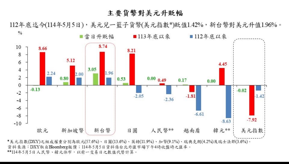 截至昨天為止,新台幣兌美元今年以來累計升值8.74%,在主要貨幣中居冠,強過歐元的8.66%、日圓8.21%、新加坡5.12%、韓元的4.45%;累計民國112年底以來,新台幣兌美元也轉為升值1.96%。(如上圖,翻攝央行臉書粉絲專頁)
