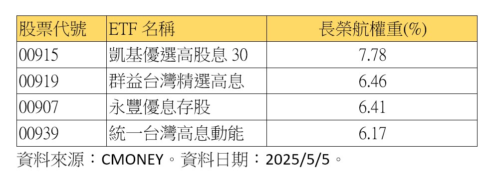 進一步檢視, 12檔台股高股息ETF持有長榮航,持有權重超過6%者包含凱基優選高股息30(00915)、群益台灣精選高息(00919)、永豐優息存股(00907)、統一台灣高息動能(00939)。