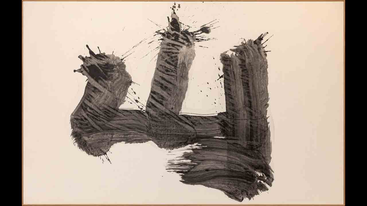 ↑圖說:井上有一 Yuichi Inoue(1916-1985),山│1966│146×230cm│墨、纸。井上有一(Yuichi Inoue)無疑是20世紀下半葉最具影響力的亞洲前衛藝術家之一。美國抽象表現主義大師羅伯特·馬瑟韋爾(Robert Motherwell, 1915–1991)曾讚譽他為當代極少數真正偉大的藝術家。井上的作品以漢字為核心,不再受限於傳統書法形式,他將筆墨化為情緒與身體的延伸,以毛筆時而擊打、潑灑、書寫於特製的大型紙張上,創作出充滿爆發力與精神張力的作品,徹底顛覆了傳統書法的語彙與邊界。(圖片來源:寶吉祥藝術中心提供)