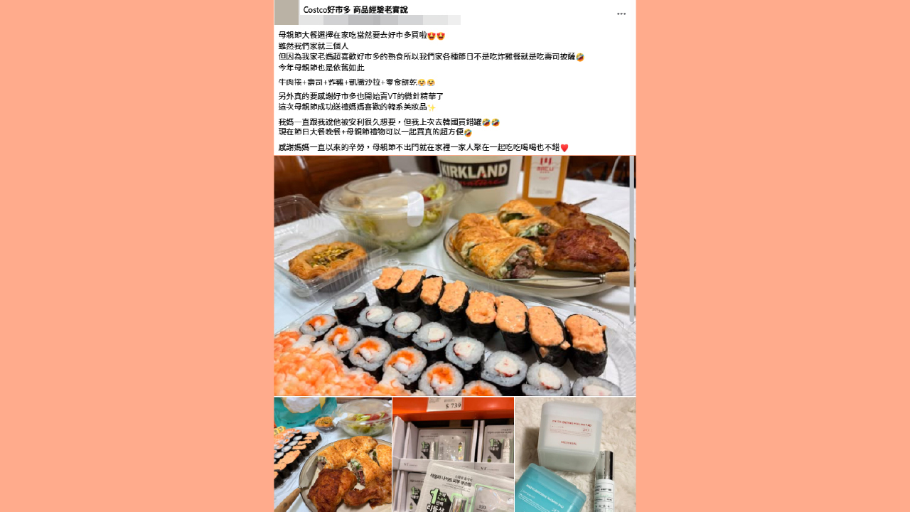 母親節檔期將至,不少家庭選擇避開外出用餐人潮,改在家團聚慶祝節日。一名網友近日在「Costco好市多 商品經驗老實說」社團分享,今年母親節家庭大餐照例選擇到好市多採購,熟食區成為他們家的節日標配,牛肉捲、壽司、炸雞、凱撒沙拉搭配零食餅乾,豐盛又方便,讓人直呼:「我們家節日不是炸雞就是壽司披薩!」