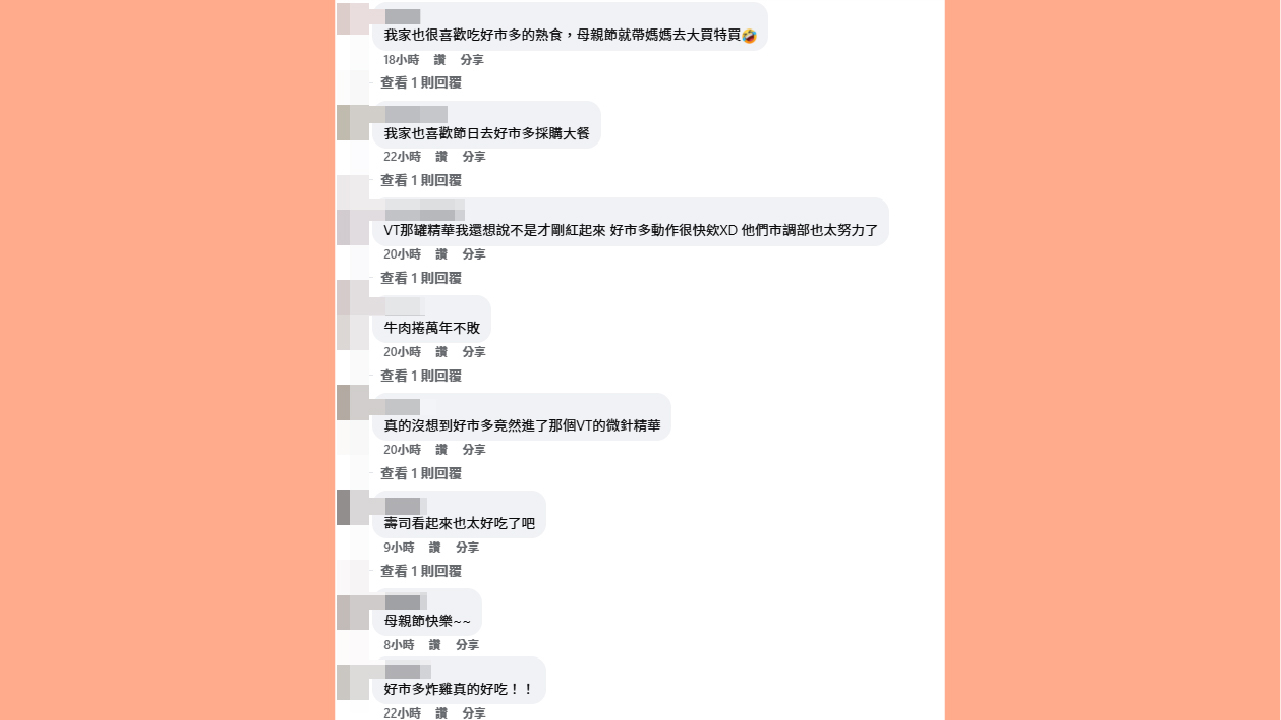 「好市多炸雞真的好吃!」「牛肉捲萬年不敗」「我也在好市多看到那瓶VT,還送面膜耶!」網友紛紛留言分享自家母親節採購清單與使用心得,有人指出好市多的價格比起韓國當地其實差不多,甚至更實惠,感嘆「他們市調部也太努力了」。