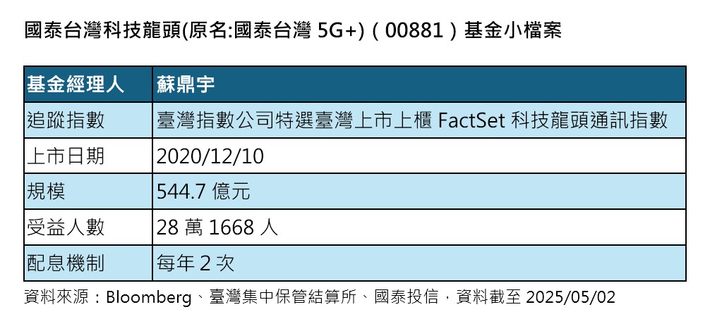 國泰台灣科技龍頭(00881)基金經理人蘇鼎宇說,00881採半年配息機制,目前台灣已是全球AI「軍火庫」,可透過00881囊括台灣科技龍頭上中下游產業,打包晶片設計、晶圓代工及AI伺服器代工巨頭。