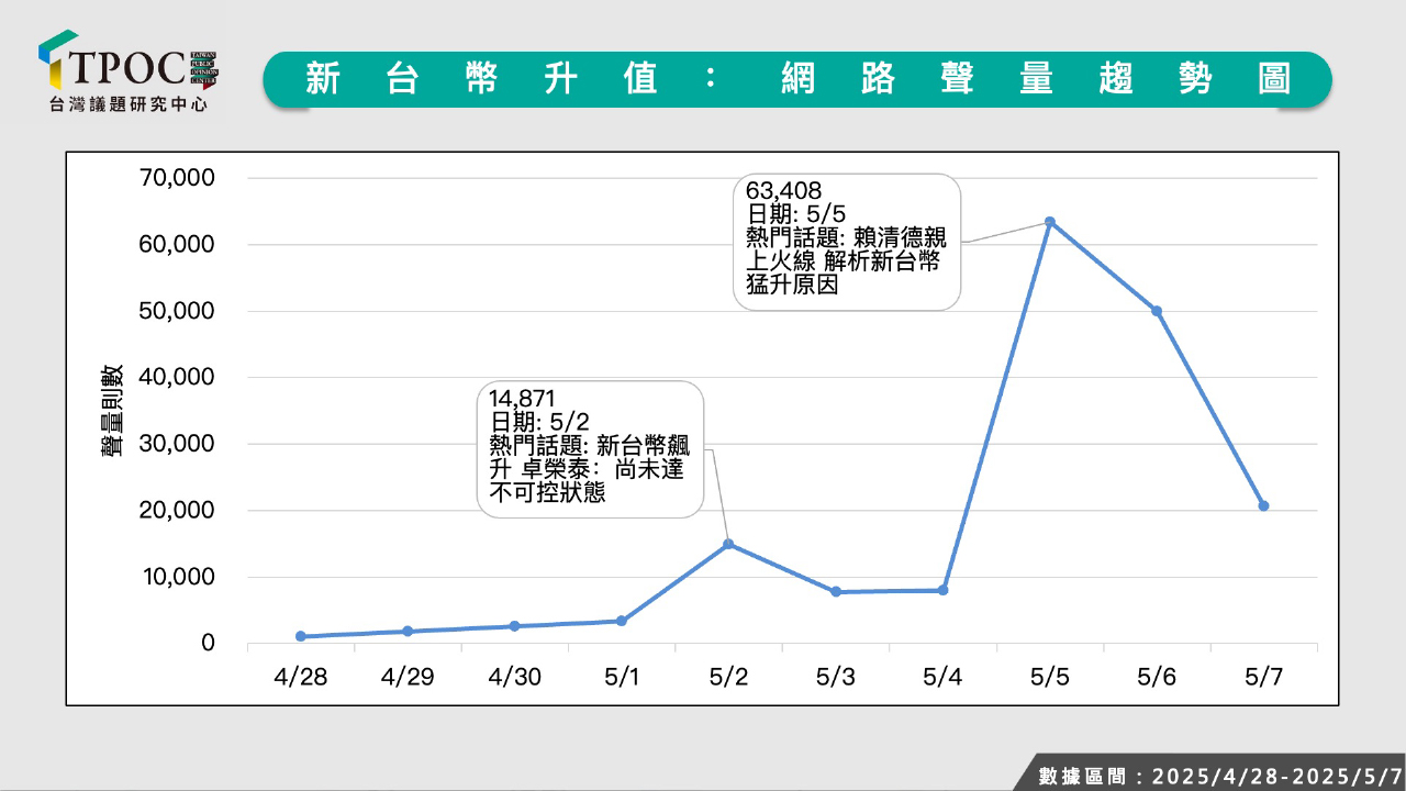 TPOC台灣議題研究中心透過QuickseeK快析輿情資料庫,蒐集4月28日至5月7日之間,網路社群上討論「新台幣升值」的聲量數據。調查期間內,每日平均聲量落在1.7萬則左右,而在5月2日新台幣飆升當天,行政院長卓榮泰在立法院答詢強調,目前尚未達到「不可控」的狀況,引發網友高度關注,單日聲量突破1.4萬則。
