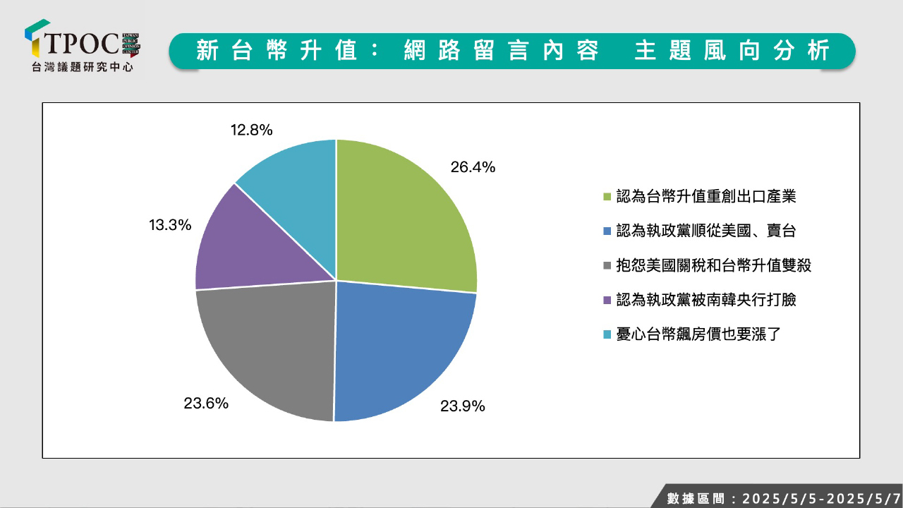 透過主題風向分析網路留言內容也發現,在這波討論中,在主要的討論面向中,聲量占比最高的話題為「認為台幣升值重創出口產業」,佔比26.4%;「認為執政黨順從美國、賣台」討論次之,佔比23.9%;「抱怨美國關稅和台幣升值雙殺」排名第三,佔比23.6%;「認為執政黨被南韓央行打臉」佔比13.3%;「憂心台幣飆房價也要漲了」佔比12.8%。
