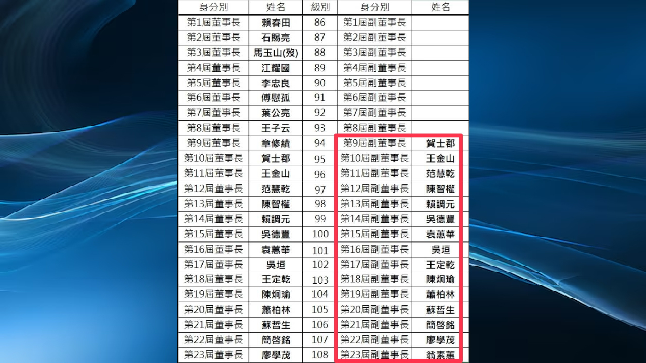 ↑圖說:根據EMBA校友基金會歷屆董事長與副董資料,EMBA校友基金會第9屆起即設有副董事長職務,至今已有14屆。(圖片來源:台大EMBA校友提供)