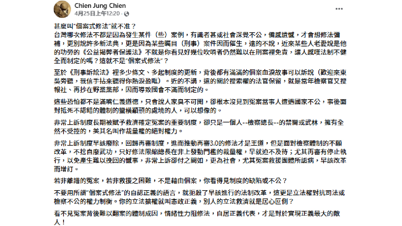 ↑圖說:前最高法院法官錢建榮律師認為,非常上訴不應是檢察總長一個人的武林,須修法解決法制不足。(圖片來源:翻攝錢建榮臉書)