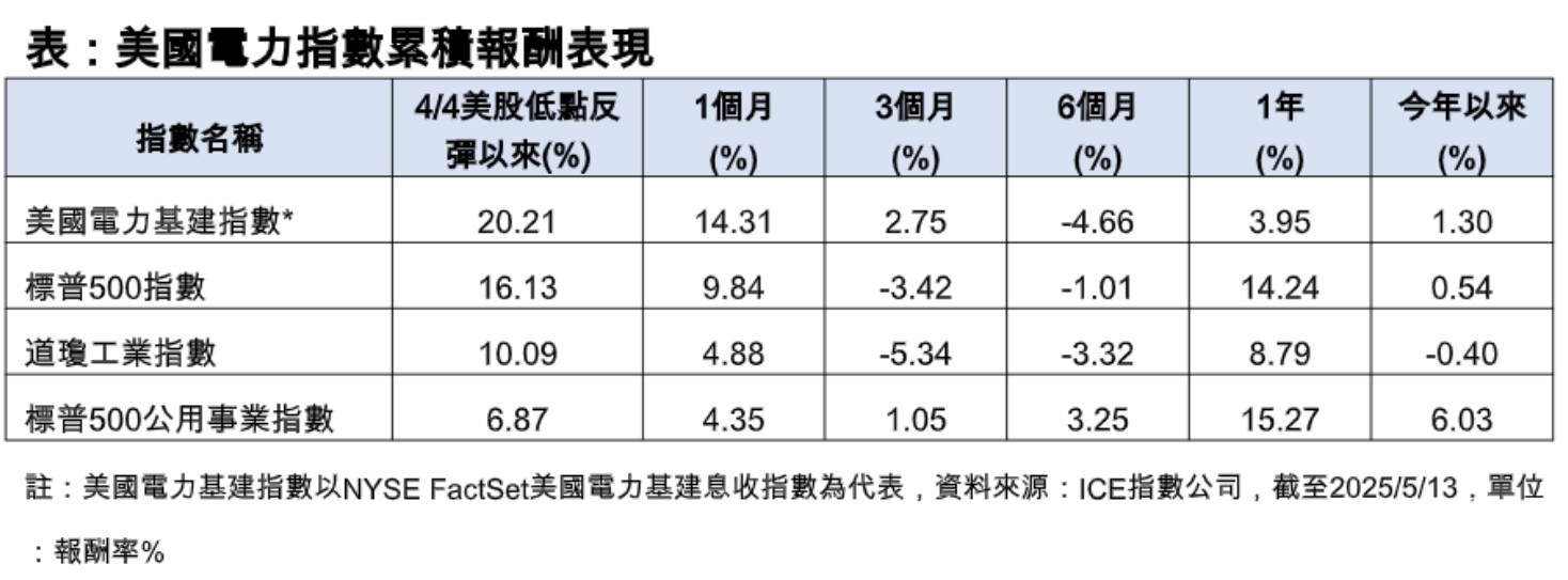 法人強調,4月關稅戰造成電力股價回檔,不過隨美股這波反彈,電力彈升幅度比美股主要指數強勁,主要來自美國電力產業,本身受惠於設備汰舊換新潮,加上4月底西班牙、葡萄牙大停電後,電網的強固韌性管理要求激增,直接帶動電力設備升級商機大增。