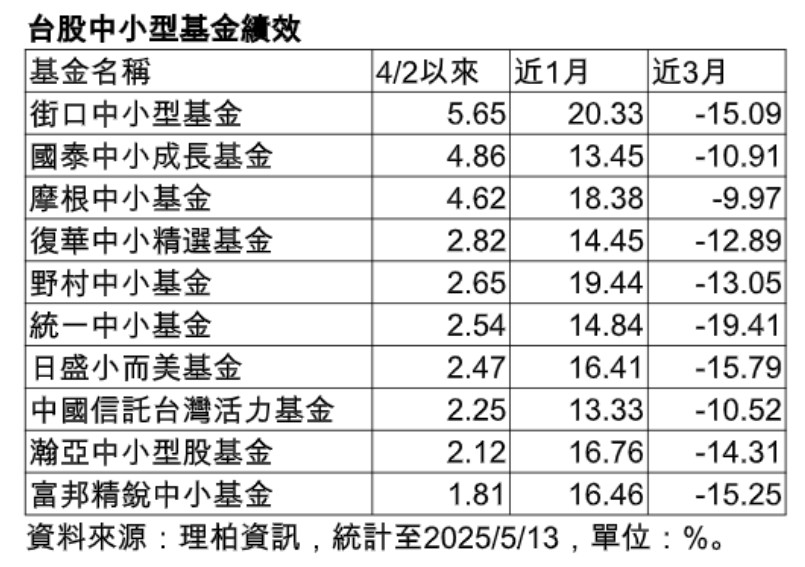 理柏資訊統計至5月13日,台股中小型基金自4月2日以來呈現正報酬,類型平均漲1.5%,優於科技類的1.2%,以及一般股票型、上櫃股票型的0.6%、-3.2%;累計台股中小型基金自4月9日大盤低點反彈以來,類型平均漲幅28.5%,優於檔數最多的一般股票型27.1%,也比加權報酬指數同期間的22.7%更為突出。
