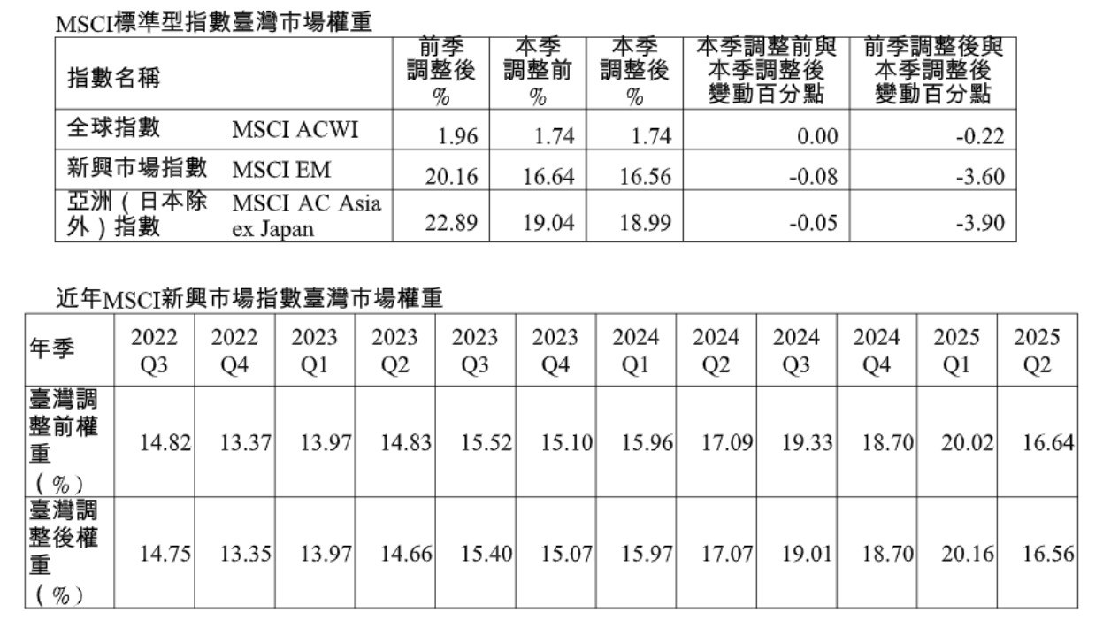 證交所指出,台股於全球標準型指數(MSCI ACWI) 權重維持不變、新興市場指數(MSCI EM) 權重下降0.08個百分點、亞洲(日本除外)指數(MSCI AC Asia ex