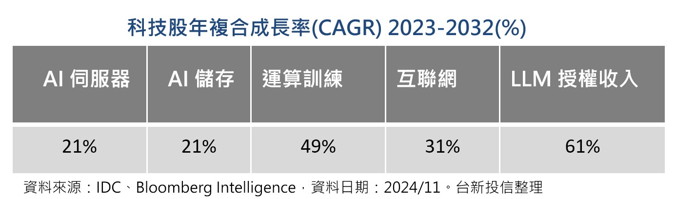 台新標普科技精選ETF(009807)基金經理人黃鈺民表示,就長線基本面來看,進入新AI時代,軟硬體雨露均霑,分析師估計,AI爆發成長將帶動AI伺服器、AI儲存、運算訓練、互聯網、LLM授權收入等相關科技產業2023-2032年營收複合成長率高達2~6成,美國科技相關ETF後市漲升行情看俏。