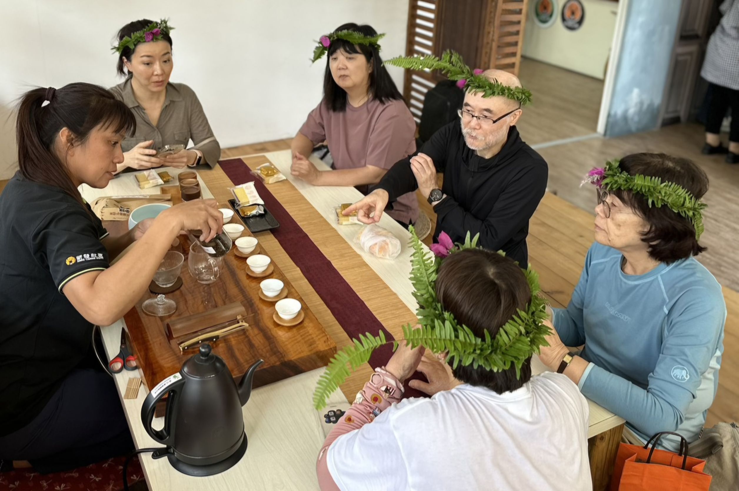 參訪期間,六龜新發社區發展協會安排導覽及製茶實作,並帶領貴賓前往「山茶故事館」,了解六龜地區如何在歷經八八風災後重建茶業、重拾地方文化。獲獎連連的「葉香白鑽茶」、「醇香紅寶茶」、「六龜橙茶」等山茶作品也成為茶席焦點,讓來賓在品茗之間深入理解背後的產地精神與工藝價值。行程亦包含在地風味餐點體驗,從生態導覽、農事體驗、茶席文化到美食饗宴,構築出一場多層次的農村文化旅程。