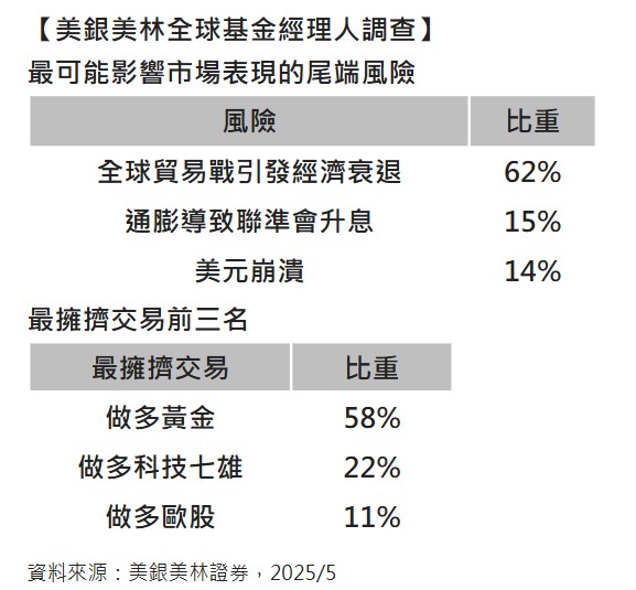 在其他調查方面,全球貿易戰引發經濟衰退為最令人擔憂的三大尾端風險之首,通膨導致聯準會升息居次,在擁擠交易方面,「做多黃金」連續兩個月霸榜最擁擠交易。