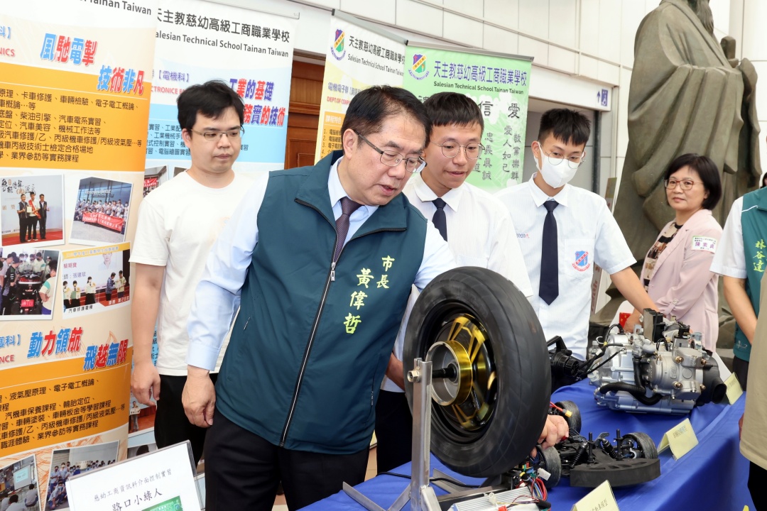 圖說:黃偉哲現場參觀動力機械相關職群展示,與學生熱烈交流作品技術 (圖片來源/台南市政府提供)