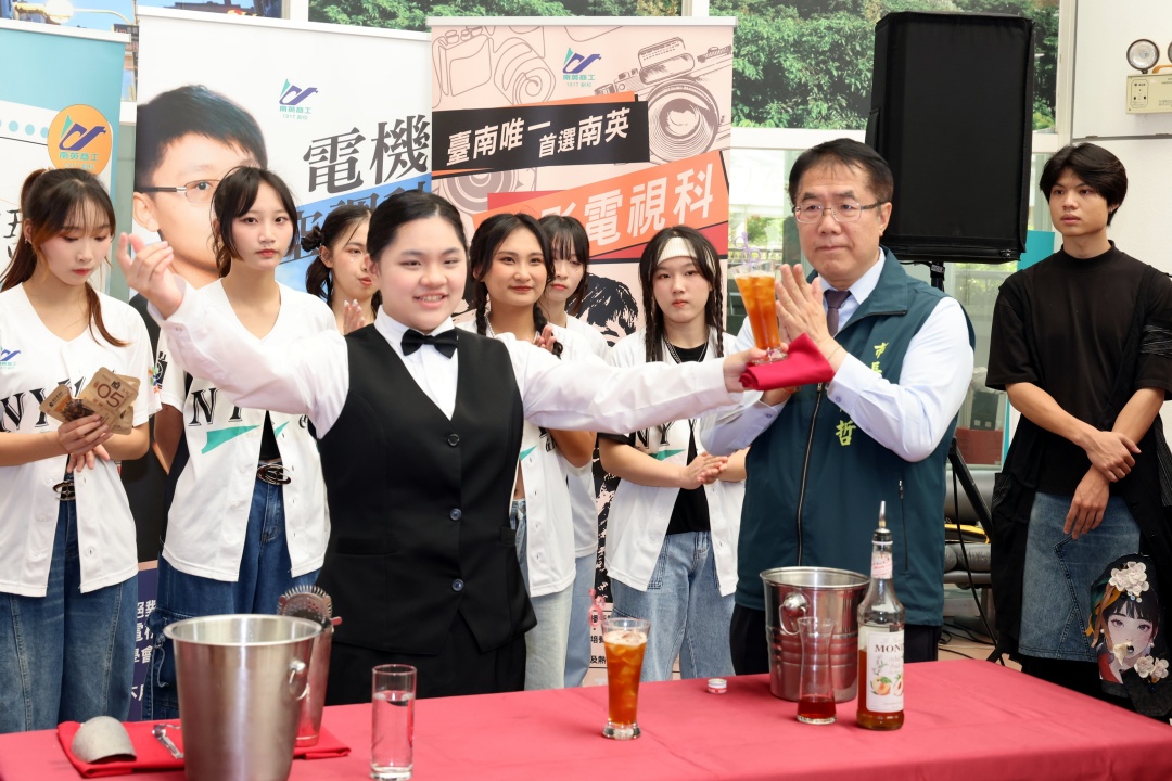 圖說 :今日記者會學生展現餐飲技藝進行調飲示範,黃偉哲肯定學生專業表現 (圖片來源/台南市政府提供)