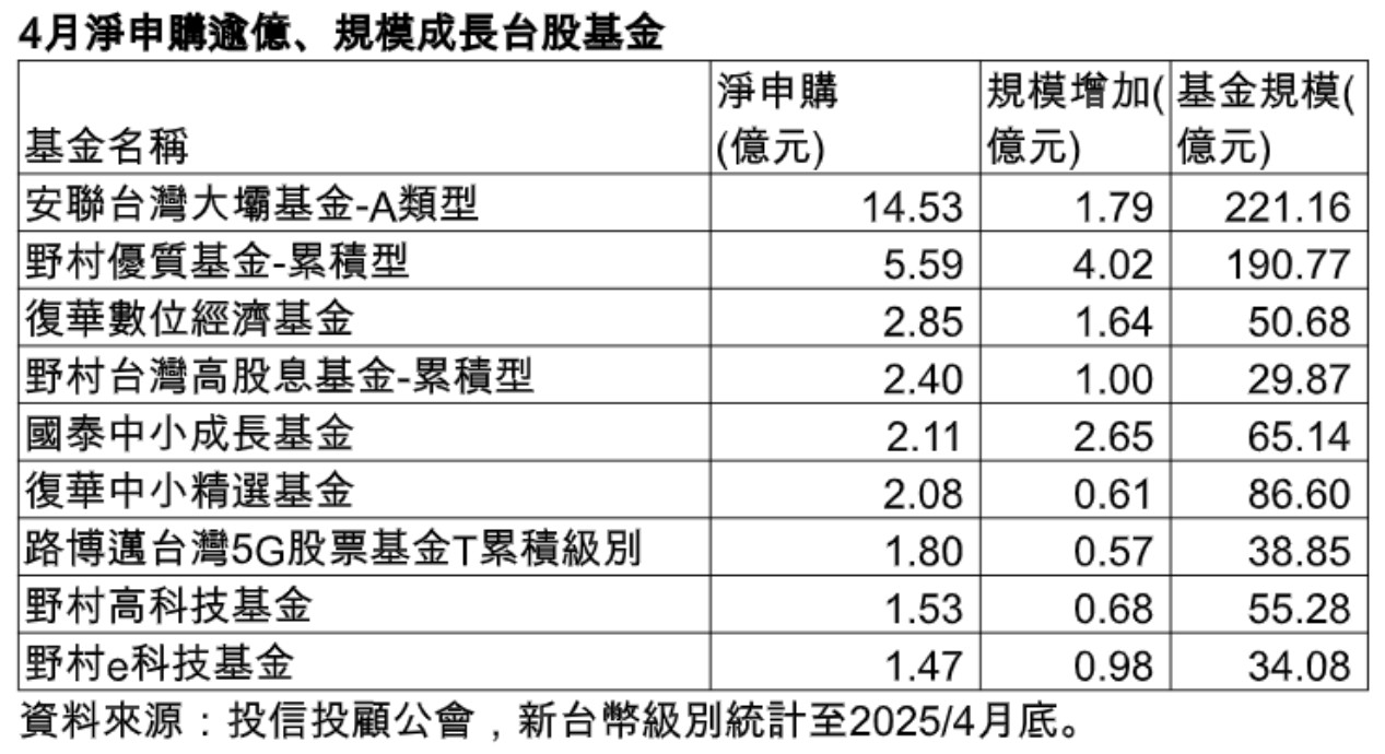 回顧4月台股大怒神走勢,導致台股基金規模減少139億元,降至4930億元,跌破5000億大關,為2024年1月以來首見,不過,仍有16檔基金獲投資人逆勢加碼,淨申購逾億元,其中有9檔表現突出,包括前述的復華數位經濟基金以及復華中小精選基金。
