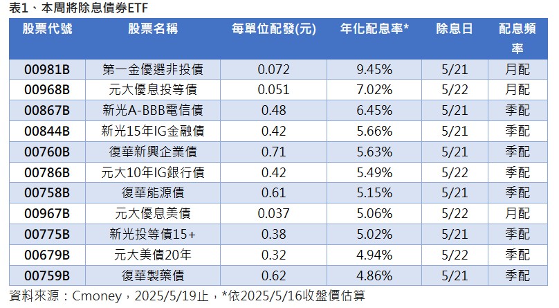 本周有多檔債券ETF除息,包括今(19)日除息的債券ETF,以及後續還有11檔將接棒除息,目前看來,第一金優選非投債(00981B)、元大優息投等債(00968B)及新光A-BBB電信債00867B)年化配息率分別為9.45%、7.02%,及6.45%。