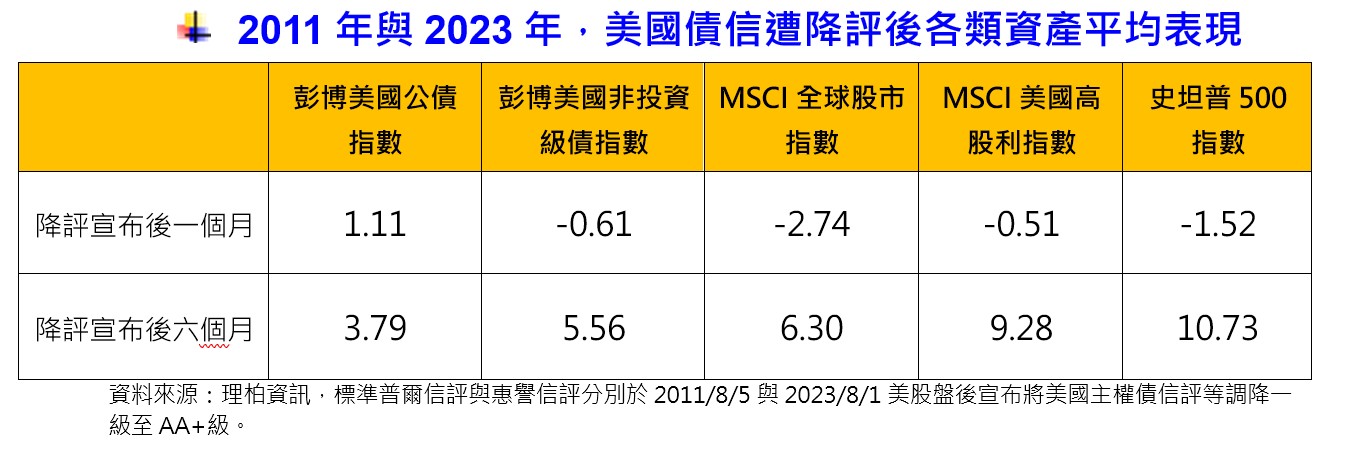 富蘭克林證券投顧表示,回顧2011年,信評公司標準普爾開出第一槍,摘除美國最高等級AAA級的債信評等,由於市場已提前反應,宣布次日,彭博美國公債指數反倒是利空出盡,彈升0.86%;2023年再遭惠譽降評,宣布次日僅小幅下跌0.19%。