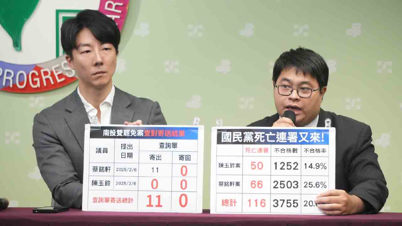 根據中選會資料,陳玉鈴案出現50筆死亡連署,不合格率14.9%;蔡銘軒案則高達66筆死亡連署、不合格率達25.6%。民進黨發言人吳崢痛批,國民黨明知違法仍故技重施,嚴重違反民主精神。