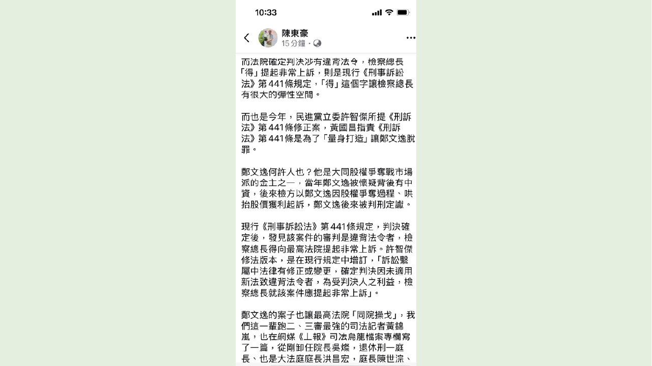 ↑圖說:陳東豪認為,非常上訴的修法並非為個案「量身打造」,而是針對制度性問題的調整。(圖片來源:翻攝自陳東豪臉書)