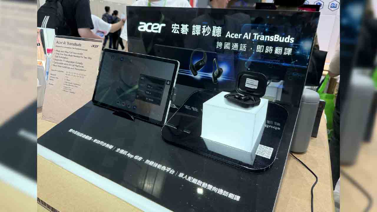 宏碁這次展出「譯秒聽」耳機即時翻譯(如下圖,記者李錦奇攝影),使用者只需把附件插入手機或平板,開啟藍牙,選擇語言,無論與他人通話或參與線上會議,軟體會即時翻譯,並且顯示逐字稿在螢幕上供參。
