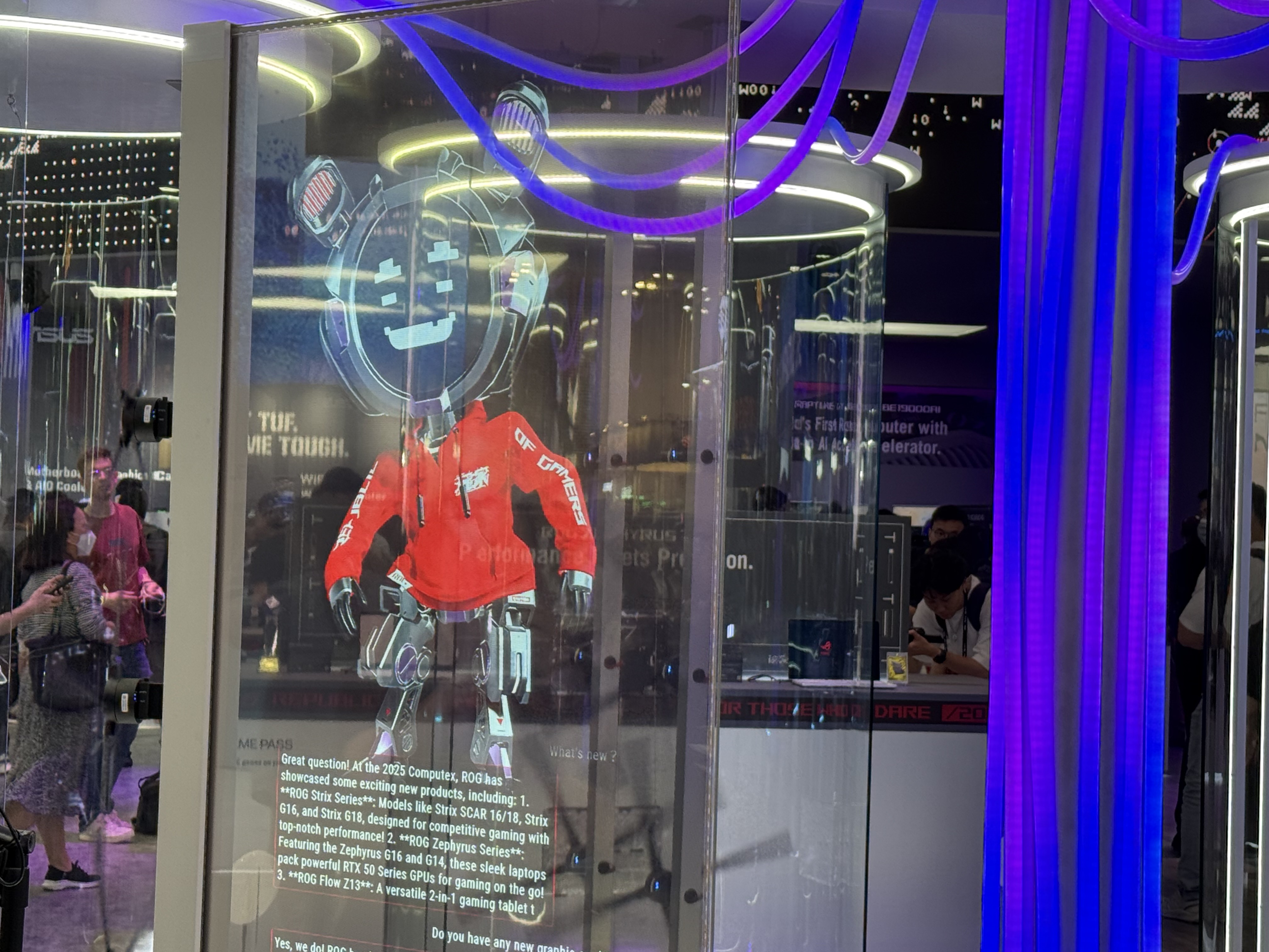 走進華碩展場,映入眼簾的是投影顯示的虛擬導覽機器人OMNI(如上圖,記者李錦奇攝影),民眾可以透過麥克風與它對話,語音辨識系統就會直接顯示在透明玻璃上,介紹華碩此次參展重點。