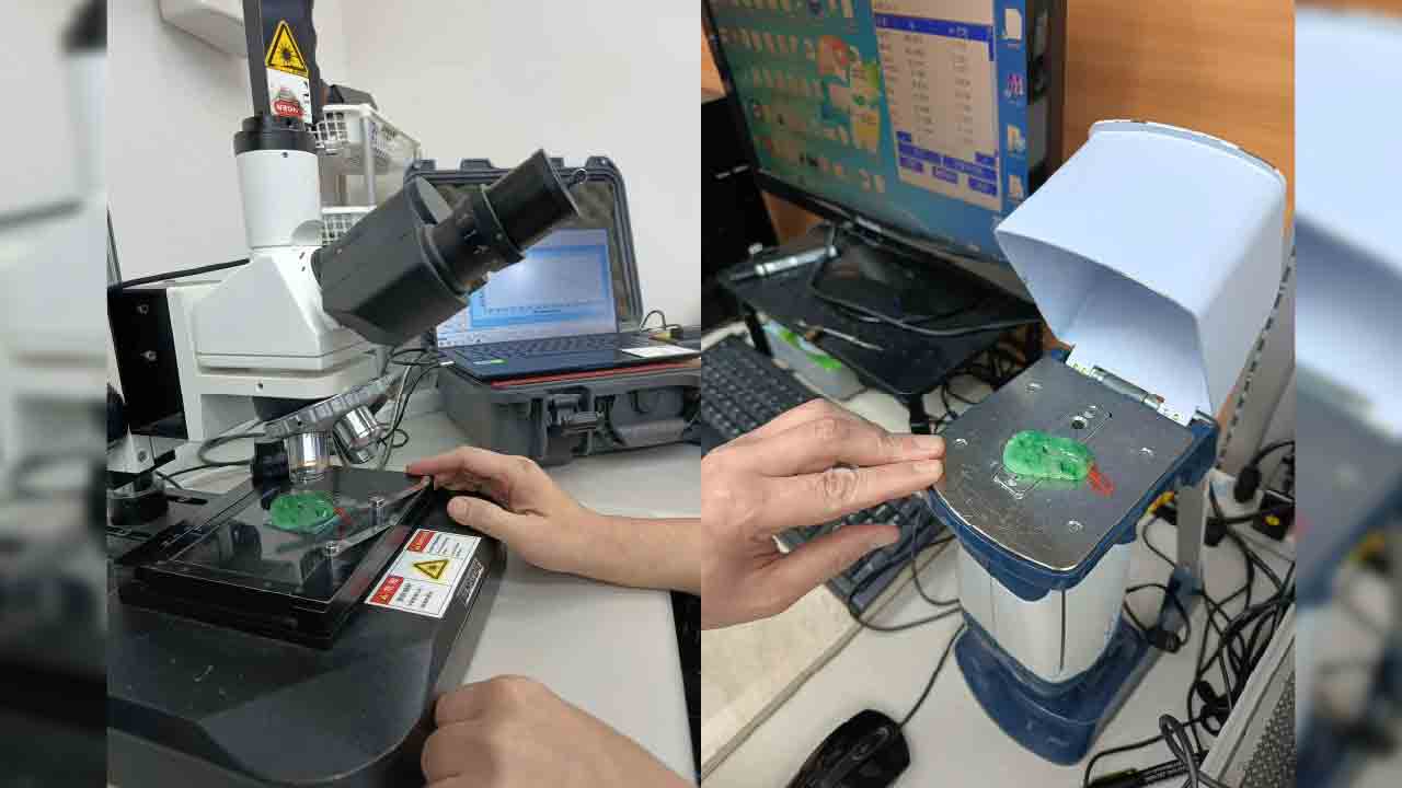↑圖說:珠寶鑑價師「花輪哥」黃傑齊被控以近似官方機構的名稱經營珠寶鑑定,檢方依詐欺罪嫌起訴。圖為合格的鑑定所鑑定玉石過程。(圖片來源:翡翠玉石消費者保護會提供)
