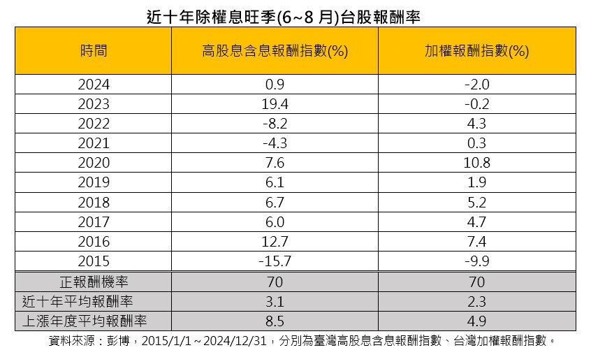 統一投信表示,台股除權息高峰約落在每年的六至八月。據彭博統計過去十年台股除權息旺季數據,臺灣高股息含息報酬指數及加權報酬指數正報酬機率達到七成。