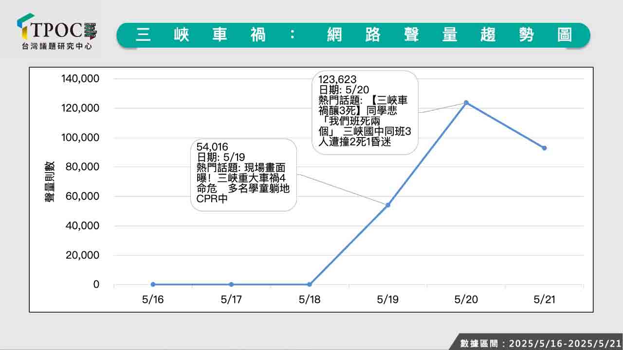 TPOC台灣議題研究中心透過QuickseeK快析輿情資料庫,蒐集三峽車禍事故發生前後的網路輿情聲量數據,結果發現,5月19日車禍事故發生當天網路聲量暴衝,單日聲量超過5.4萬則,尤其車禍現場畫面、相關影片曝光後,引發全網關注。直到5月20日事發隔天,單日聲量高達12.3萬則,熱門話題包括有死者同班同學接受媒體訪問表達哀痛,令大批網友備感心痛及遺憾,紛紛留言表達慰問之意。
