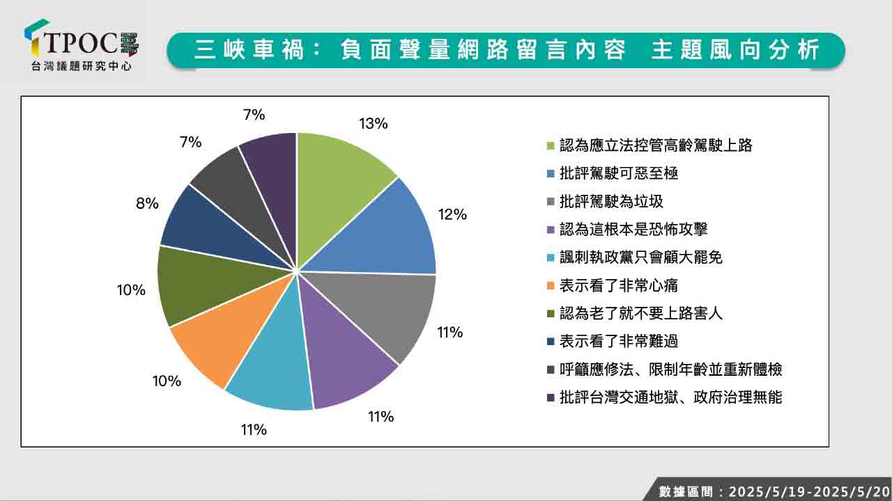 進一步透過主題風向分析網路負面聲量留言內容,結果顯示,熱門討論主題中,有超過四成聲量集中在譴責肇事者,包括「批評駕駛可惡至極」聲量佔比12%、「批評駕駛為垃圾」佔比11%、「認為這根本是恐怖攻擊」佔比11%、「認為老了就不要上路害人」佔比10%;另有約兩成左右聲量具體提出政策訴求,如聲量佔比最高的言論「認為應立法控管高齡駕駛上路」,佔比達13%,也有7%留言提出「呼籲應修法、限制年齡並重新體檢」,顯示社會輿論期待政府針對高齡駕駛進行制度改革,意象相當明確。
