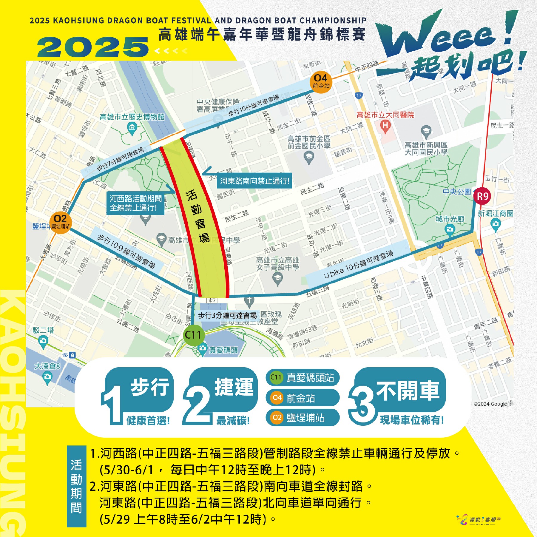 活動期間,河西路與河東路部分路段將實施交通管制,其中河西路中正四路至五福三路段每日中午12時至午夜12時全線封閉,禁止車輛通行與停放;河東路則自5月29日起,僅保留北向通行,南向臨河側道路則全面封閉。此外,捷運橘線的前金站與鹽埕埔站距離會場僅需步行7至10分鐘,亦可從紅線中央公園站騎乘Ubike前往;輕軌與公車則建議於真愛碼頭站下車,步行約3分鐘即達活動現場。