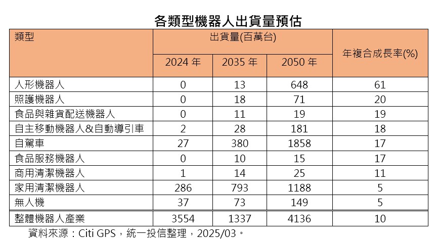 統一投信表示,據花旗集團三月統計,預期全球2035年人形機器人的出貨量將達到1300萬台,並高速成長至2050年的6.5億台,年複合增長率高達逾6成。2050年時,約每10個家庭就擁有一台人形機器人,相當於目前掃地機器人的普及率。