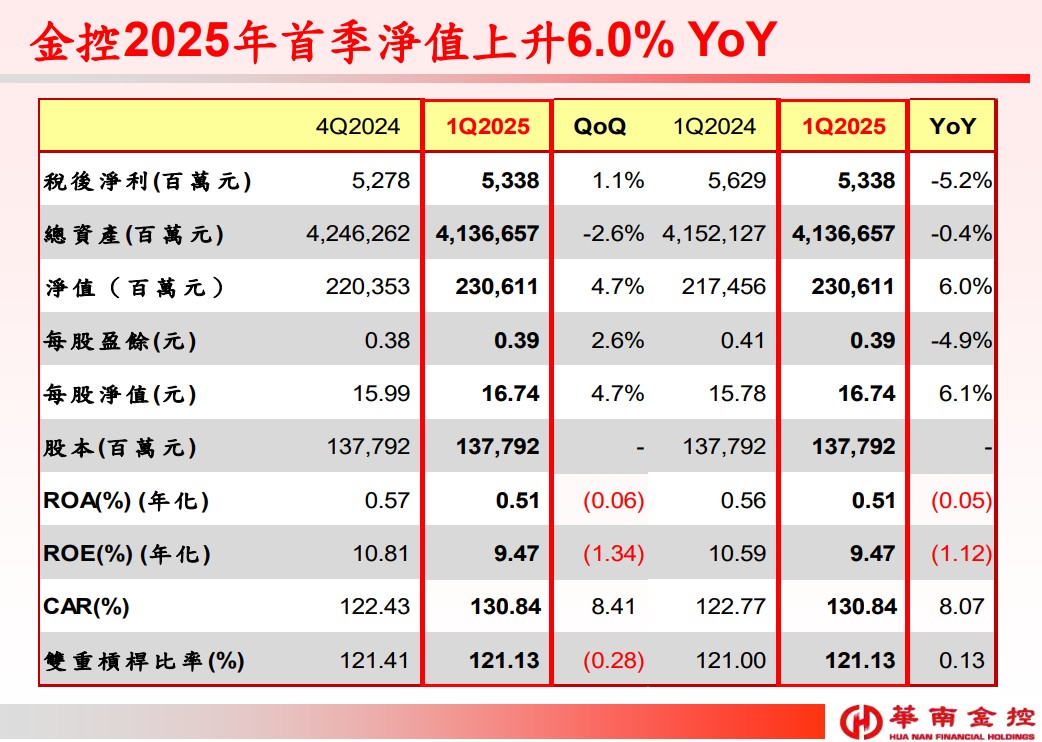 華南金首季淨值2306億元,年成長6%;每股淨值由去年底的15.99元,成長至今年首季末的16.74元,年增率6.1%。