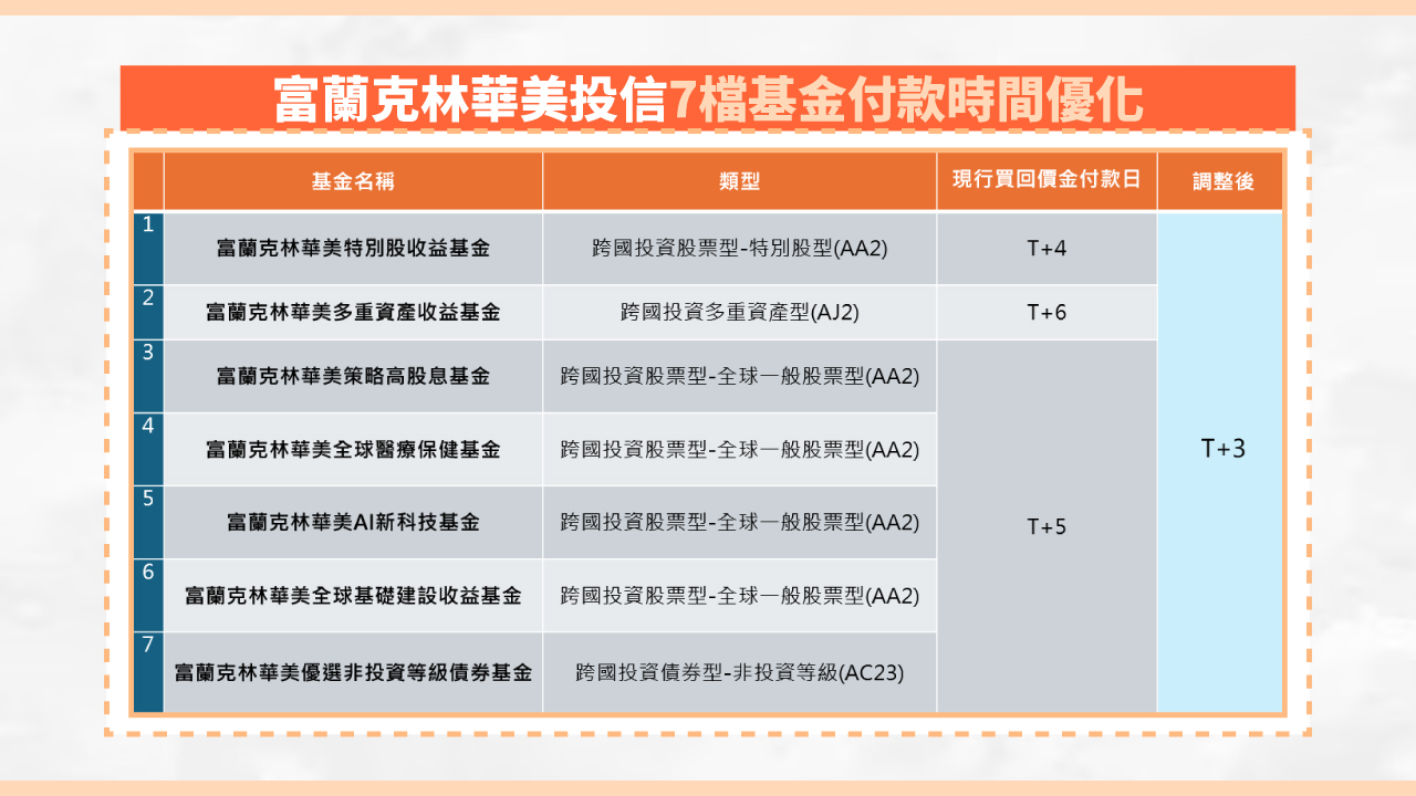 富蘭克林華美投信優化新制!旗下7基金改T+3付款 快速到帳