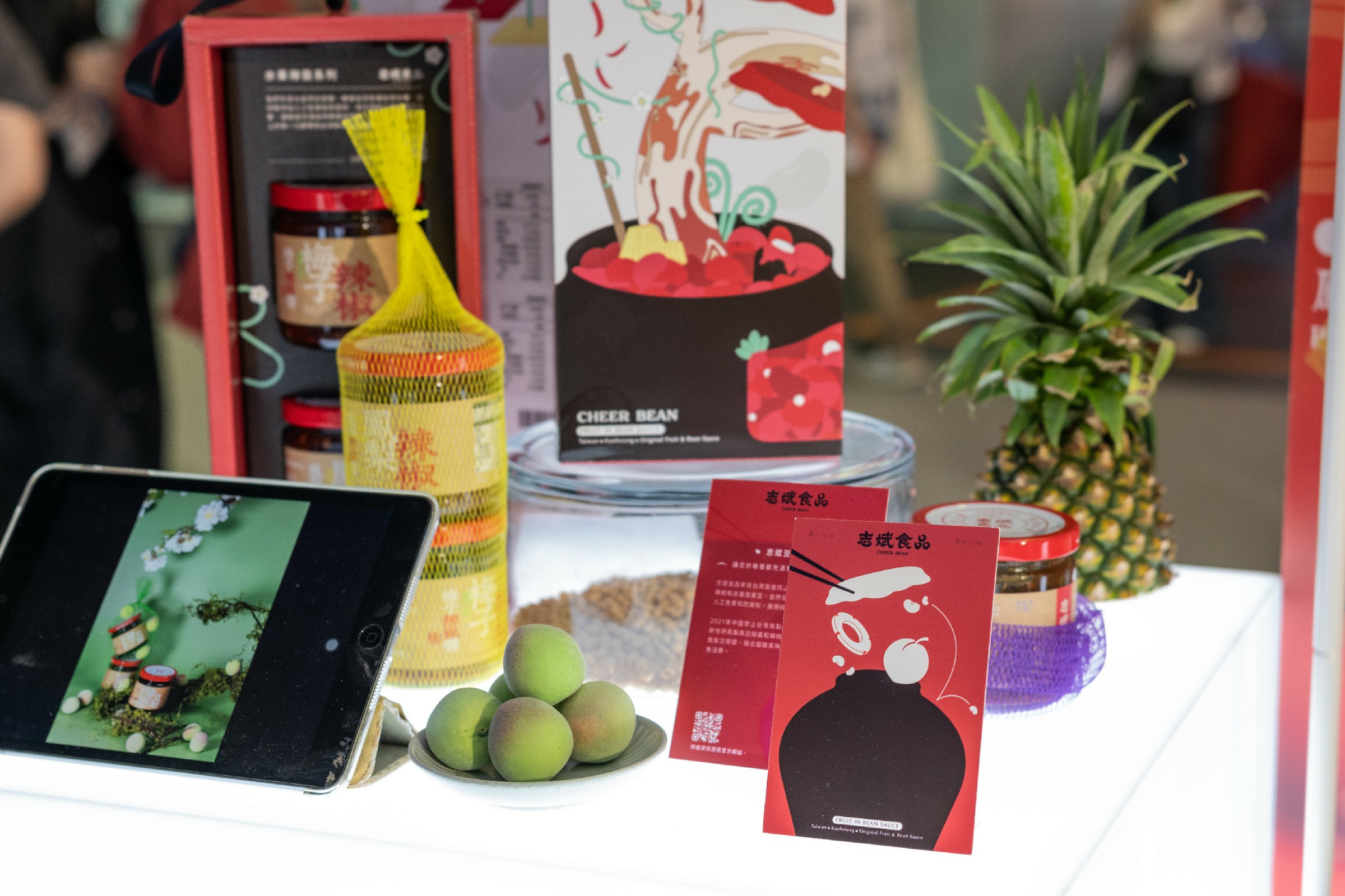 ↑圖說:「志斌食品」將梅子、鳳梨與芋頭融入豆瓣醬,並與「JoeChenArt鳩陳設計」合作設計包裝,今年端午檔期推出「醬享果樂」禮盒。(圖片來源:高雄市青年局提供)