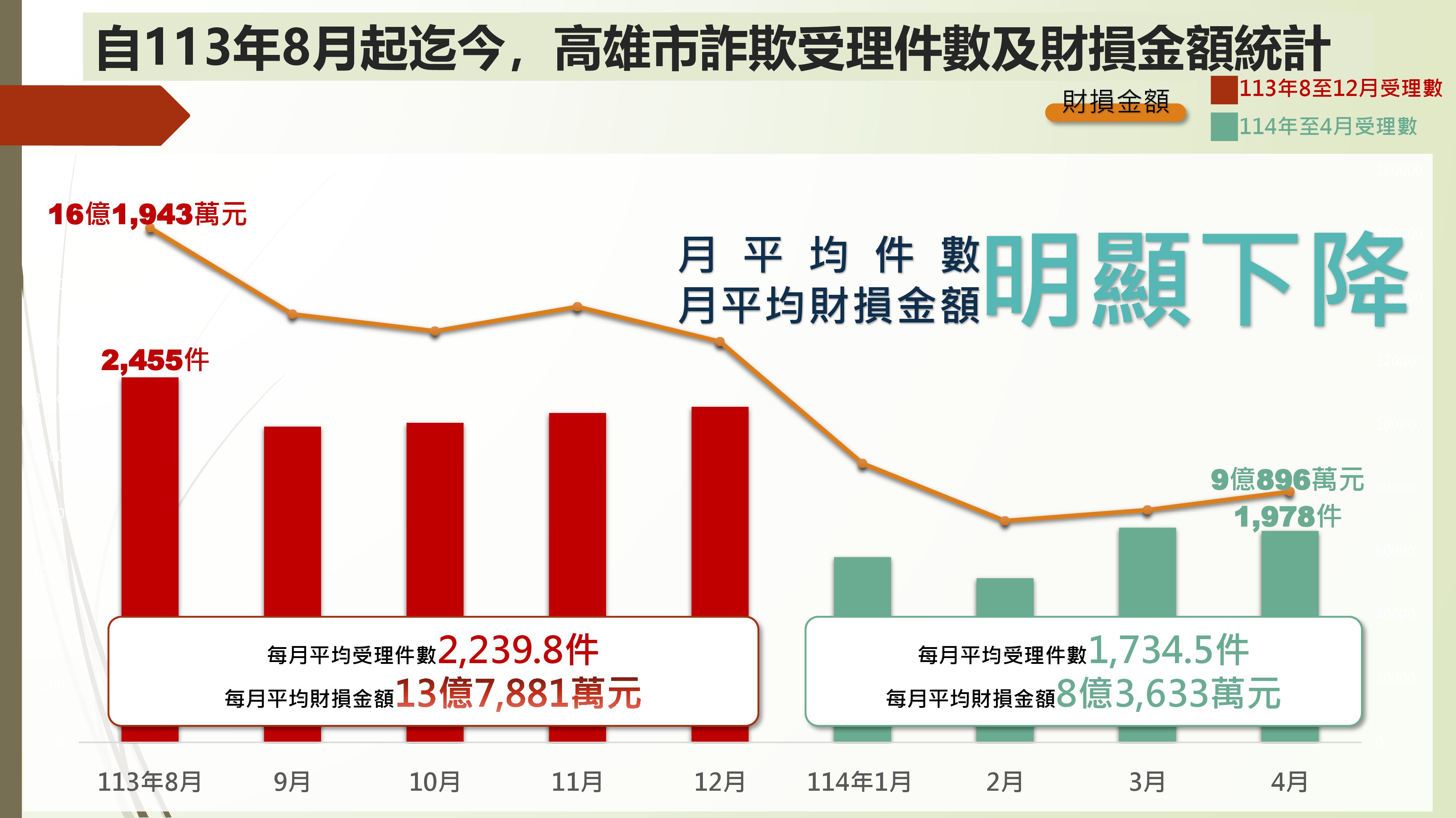 高雄市詐騙案件雖仍頻傳,但整體趨勢已呈下降。根據警政署「打詐儀錶板」資料顯示,114年4月高市受理詐欺案件共1978件,損失金額約9億元,其中假投資手法仍占最大宗。比較今年1至4月與去年下半年同期資料,受理件數與財損皆有顯著減少,顯示警方積極介入與全民識詐意識提升產生效果。