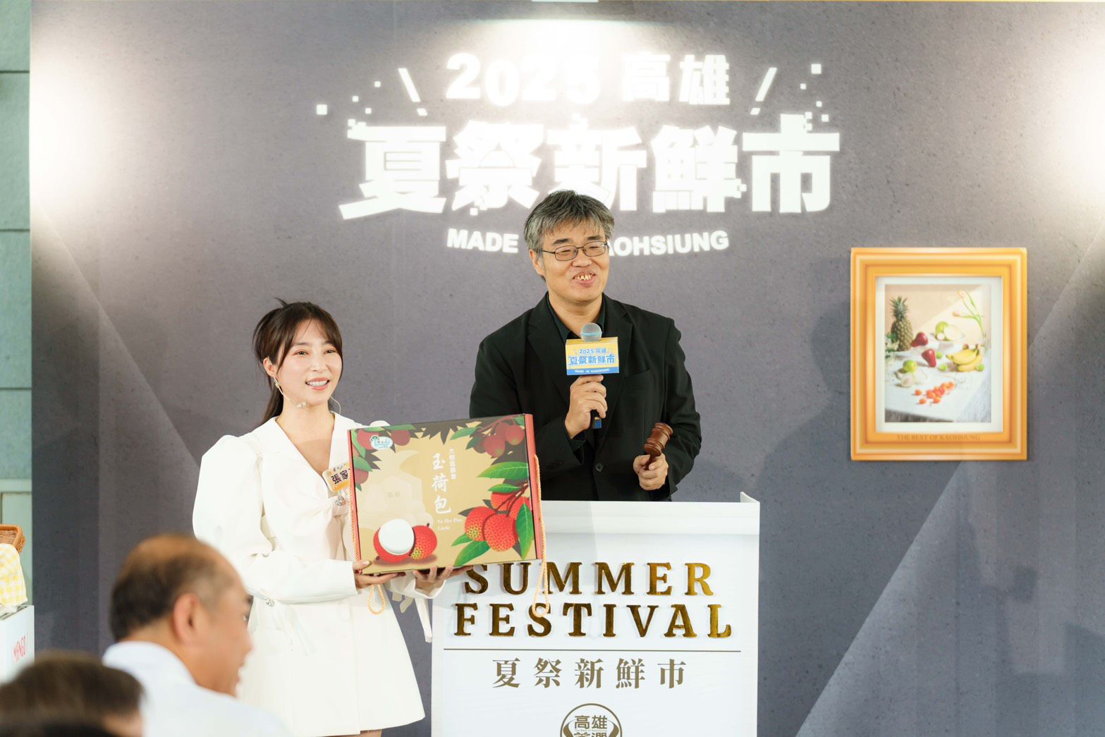 高雄市夏季農產行銷盛事「高雄夏祭新鮮市」28日熱鬧登場,活動由高雄市副市長李懷仁與藝人張家瑋聯袂主持,以一場別開生面的「水果藝術品拍賣會」揭開序幕。李懷仁現場化身帥氣拍賣官,親自主持拍賣流程,帶領來賓搶標近百件由高雄農友精心栽培、經藝術化包裝的優質農產,為活動注入活力與話題,也宣示夏季農業行銷正式啟動。