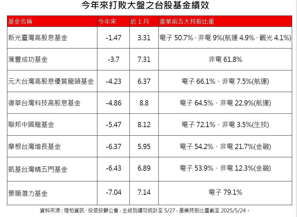 不過,法人統計同期間台股基金表現,仍有8檔擊敗大盤,進一步檢視,除了滙豐成功基金主要以非電產業為持股主軸,復華台灣科技高股息、摩根台灣增長、凱基精五門等基金持股比重亦有1-2成聚焦航運及金融類股。
