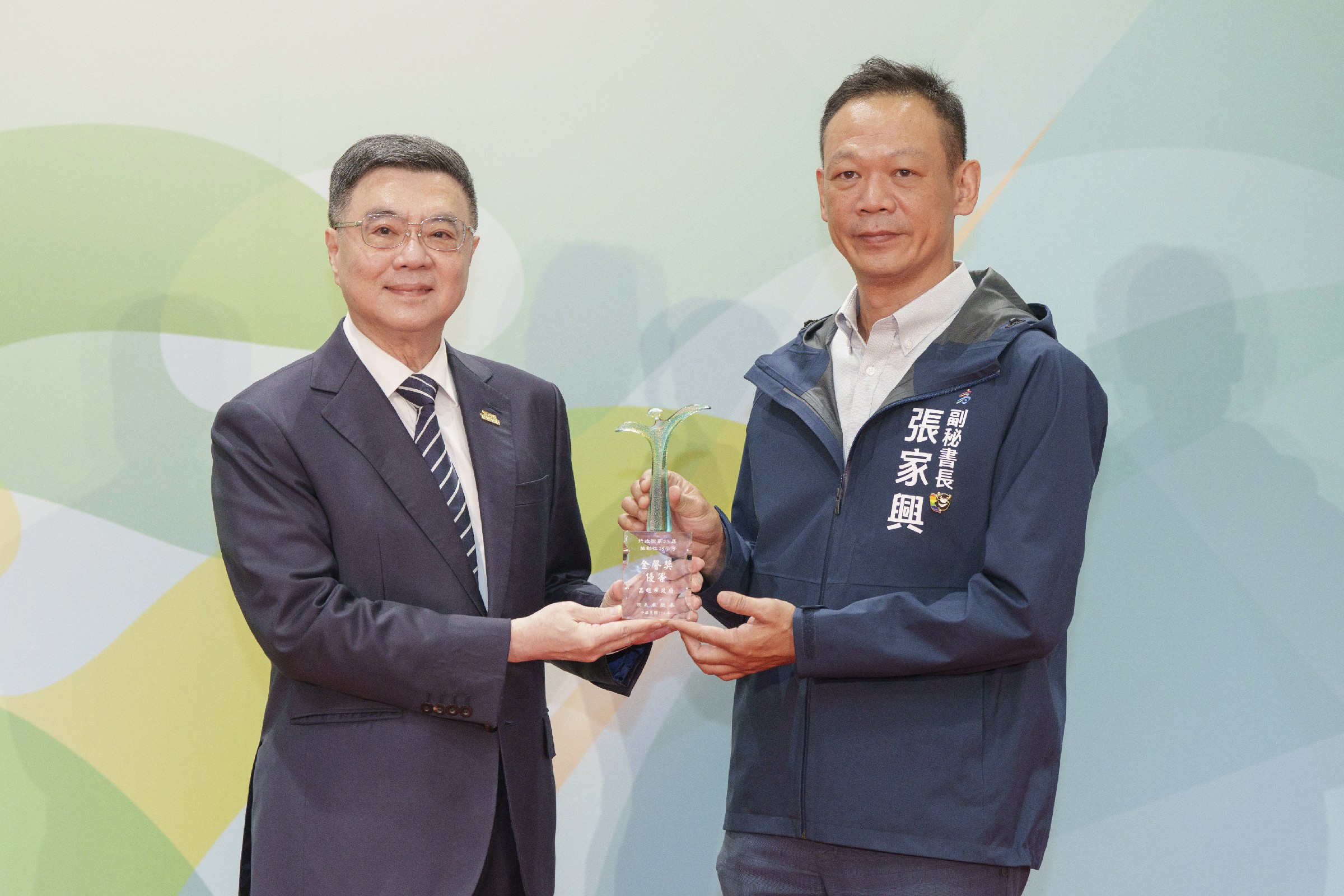 ↑圖說:行政院長卓榮泰頒贈金馨獎優等獎座,高市府張家興副秘書長代表受獎(圖片來源:高雄市社會局提供)