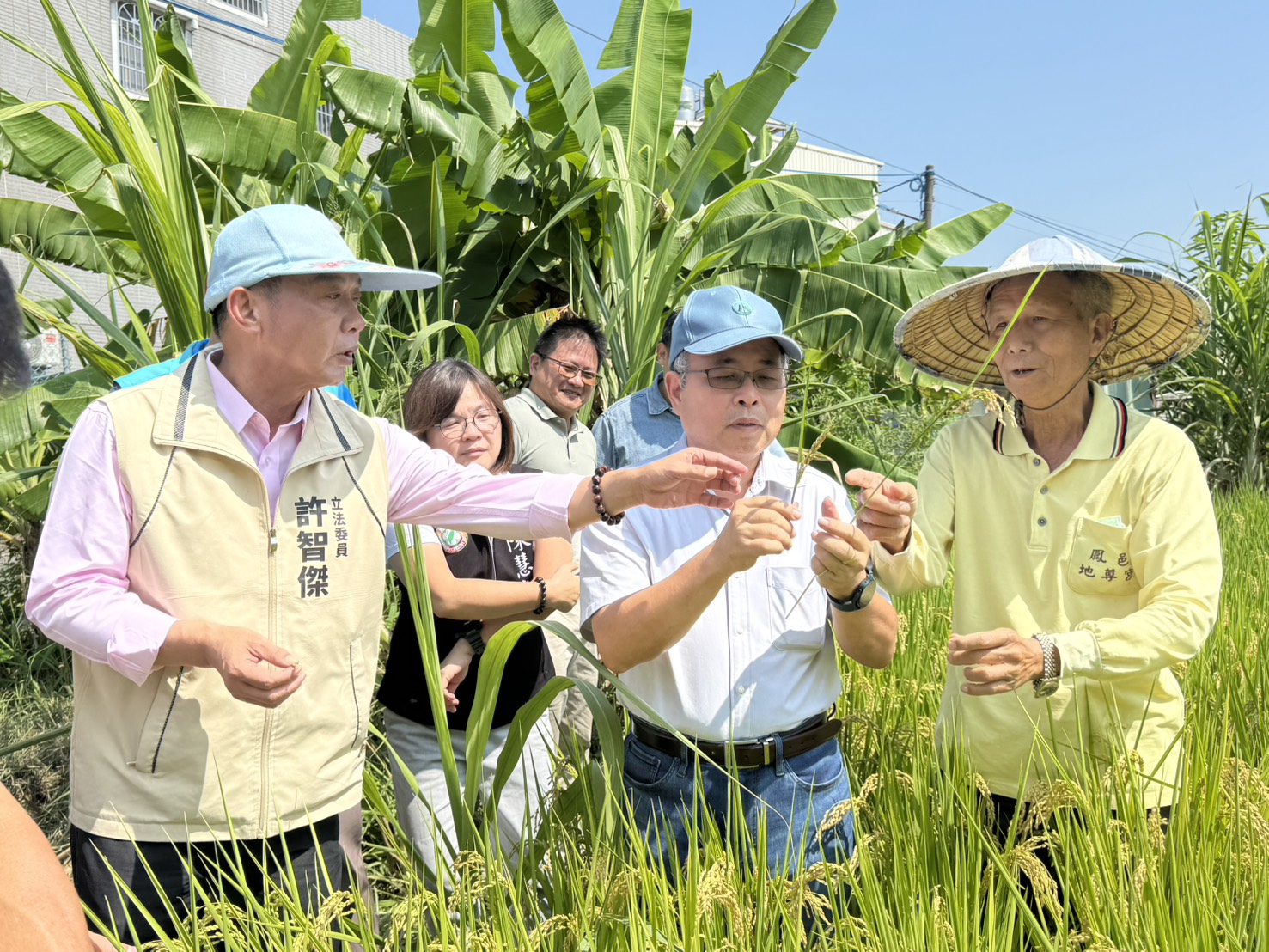 圖說:許智傑(左一)親自了解稻米收成狀況。(圖片來源:許智傑服務處提供)