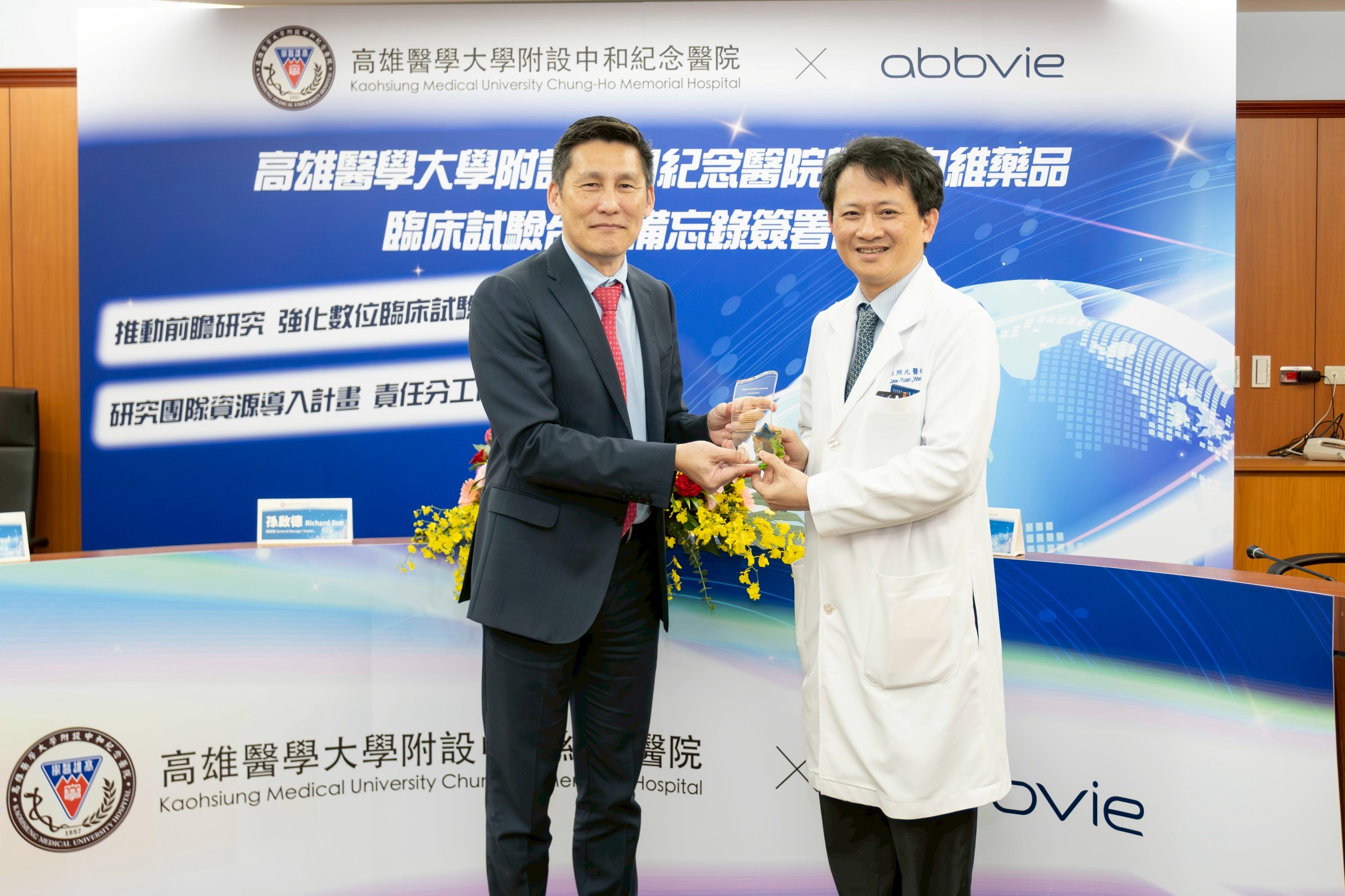 圖說:高醫與艾伯維藥品簽署MOU,總經理孫啟德(左)頒贈獎座給高醫院長王照元。(圖片來源:高醫提供)