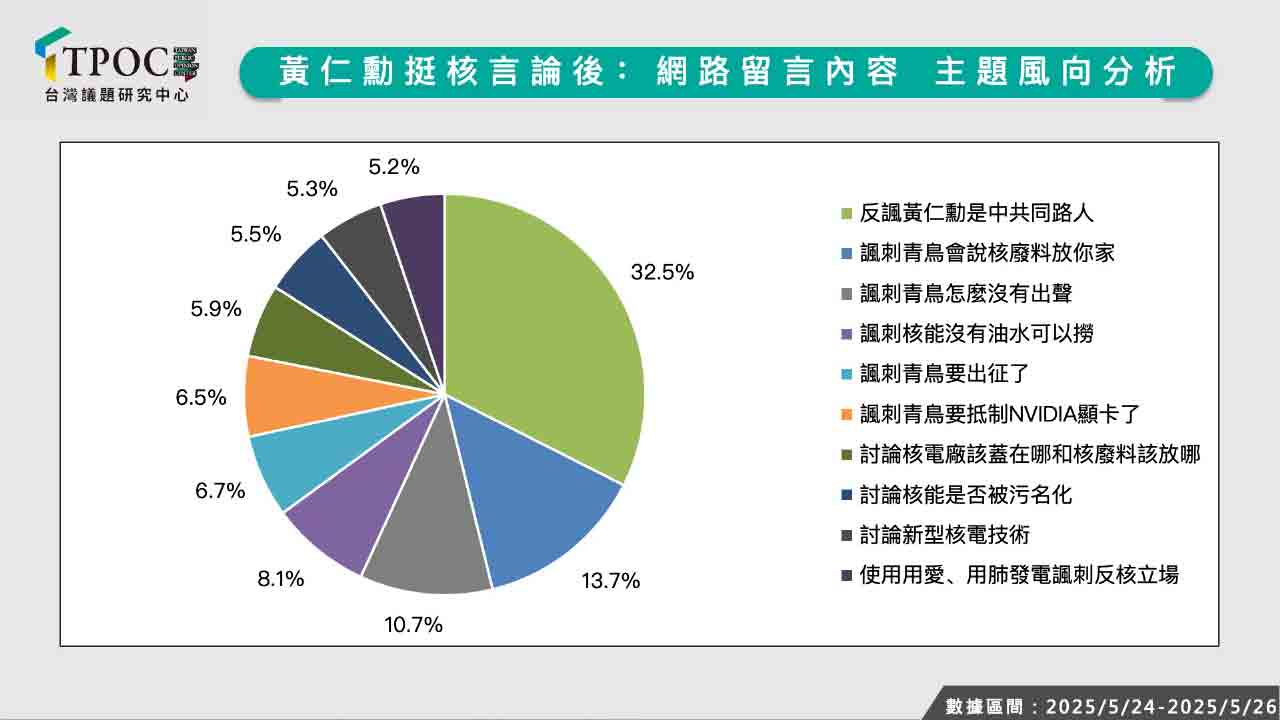TPOC台灣議題研究中心根據QuickseeK快析輿情資料庫,蒐集5月24日至5月26日之間網路輿情數據資料,並透過主題風向分析網路留言內容,了解網友們對黃仁勳「挺核」後續討論。此次調查發現,在熱門的討論面向中,聲量佔比最高的是「反諷黃仁勳是中共同路人」相關言論,主因在於藉此嘲諷反核的民進黨支持者,聲量佔比高達32.5%,且其他嘲諷綠營的言論也不少,包括「諷刺青鳥(民進黨支持者)會說核廢料放你家」、「諷刺青鳥怎麼沒有出聲」、「諷刺青鳥要出征了」、「諷刺青鳥要抵制NVIDIA顯卡了」等,佔比分別為13.7%、10.7%、6.7%、6.5%,總體而言有高達7成言論都屬於此類,代表著這波風向主要集中於對執政黨反核立場的諷刺,黃仁勳的發言恰恰成為擁核、厭綠者政治立場對抗的工具。