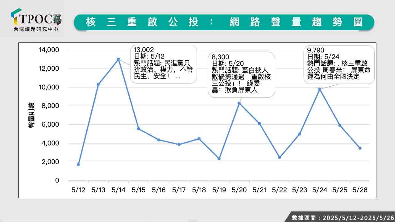 黃仁勳作為全球科技企業領袖,公開提及未來10年AI產業的最大挑戰是「能源問題」,代表著產業界長期以來對能源的焦慮感,具有高度公信力與影響力。民眾黨團等在野勢力一方面在立法院發動「核三公投」,另一方面也把握黃仁勳的高聲量,將其帶入支持核三重啟的論述當中。不過,網路數據分析結果發現,在5月12日至5月26日間,調查期間「核三重啟公投」第一個聲量高峰來自國民黨主席朱立倫5月14日撰文呼籲核電延役20年、核電廠重啟,單日聲量超過1.3萬則;第二個聲量高峰是5月20日藍白兩黨挾人數優勢通過「核三公投」一案,單日聲量達8千多則;第三個聲量高峰是5月23日中選會宣布「核電延役」預計今年8月23日舉行投票,單日聲量約9700多則。由此可見,黃仁勳挺核言論尚未顯著影響公投案的聲量。