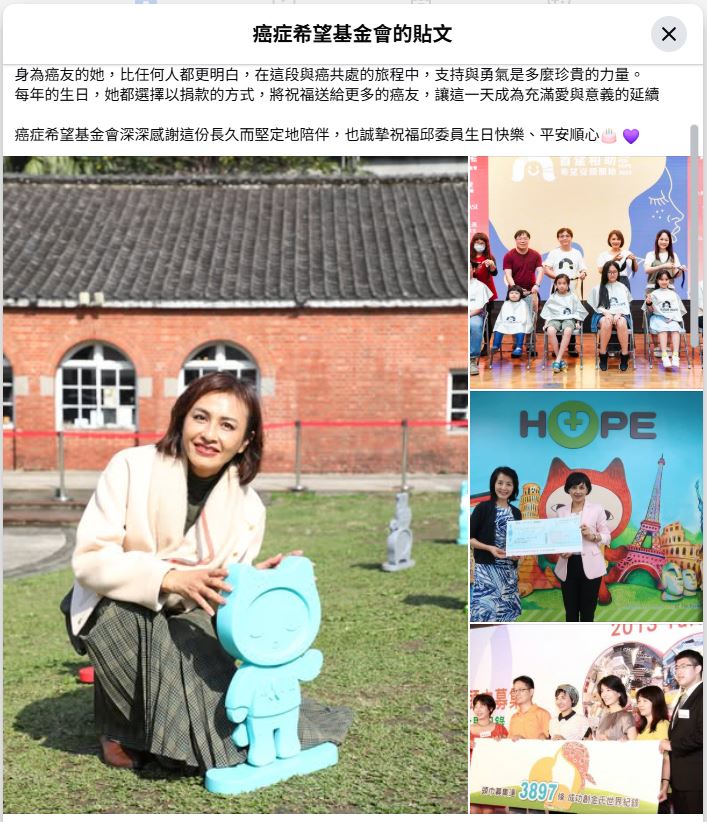 ↑圖說:癌症希望基金日前於臉書發文,除了祝福立法委員邱議瑩生日快樂之外,也揭露身為癌友的她,十多年來為基金會的支持與付出。(圖片來源:翻攝自癌症希望基金會臉書)