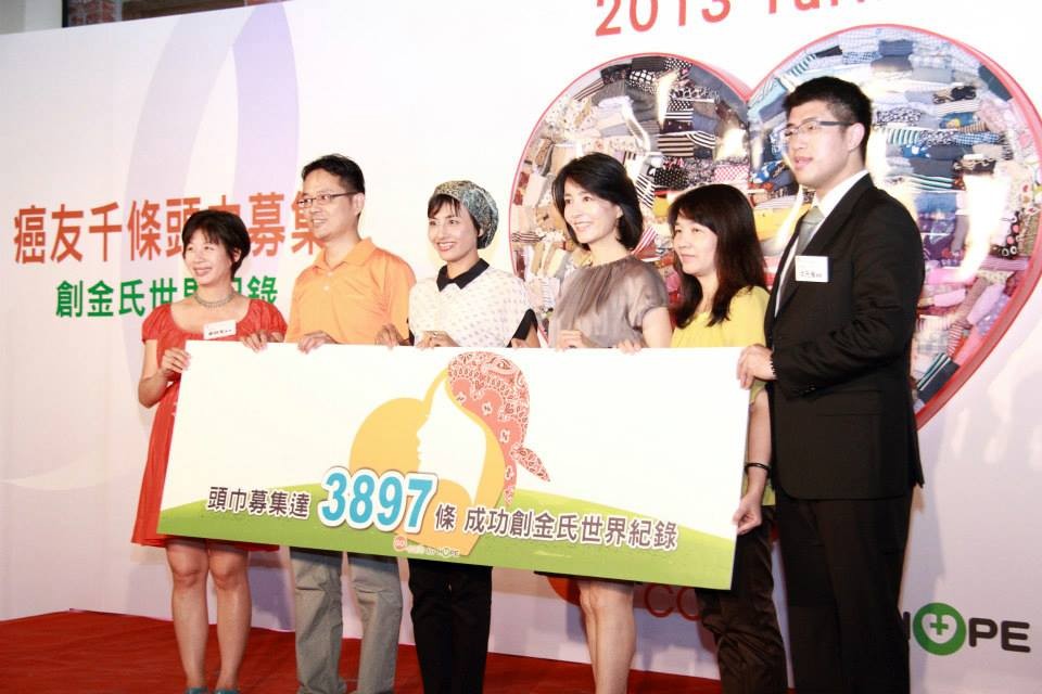 ↑圖說:2013年參加癌友千條頭巾募集活動, 募集數量創金氏世界紀錄(圖片來源:翻攝自癌症希望基金會臉書)