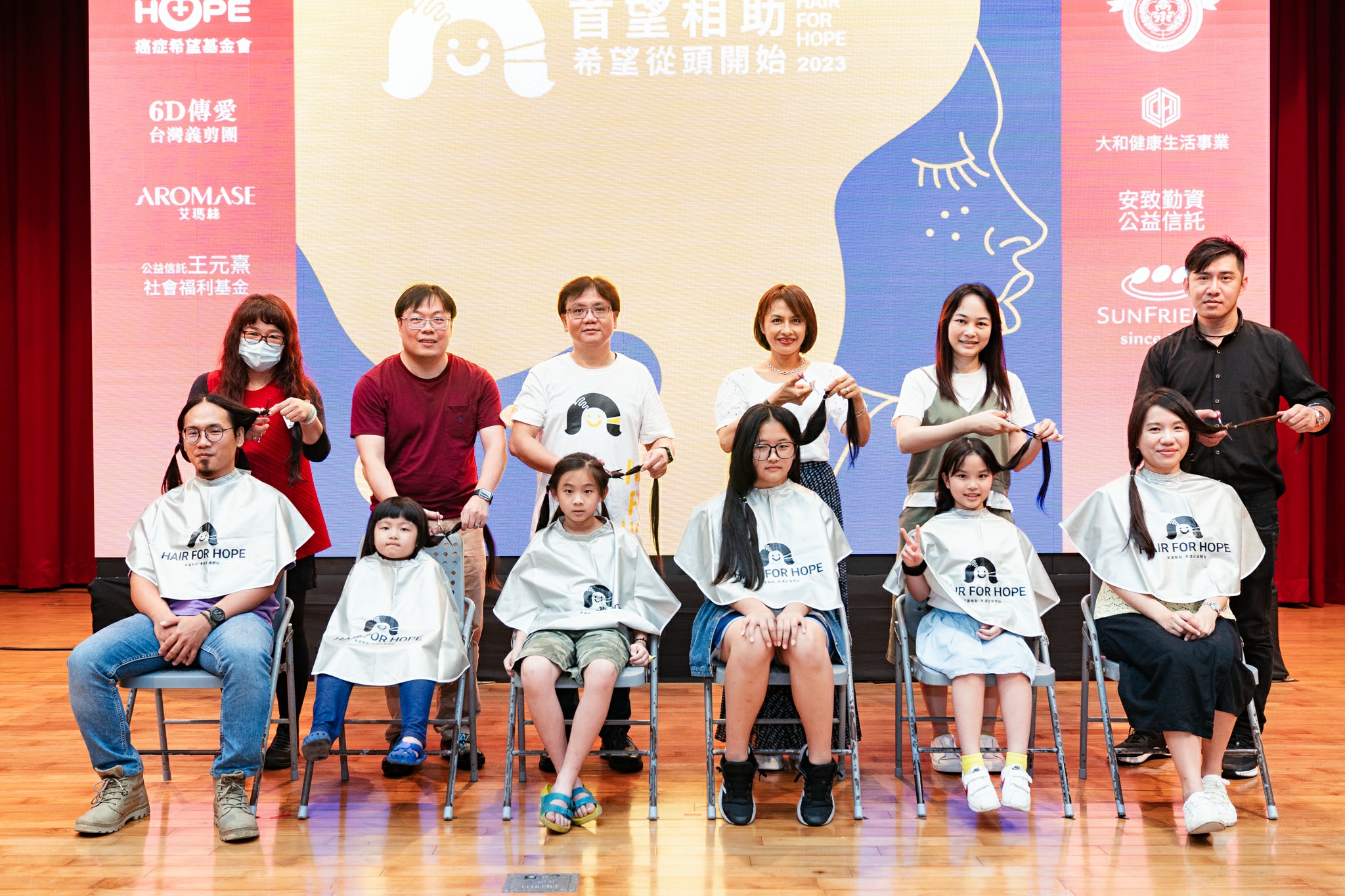 ↑圖說:2023年邱議瑩委員(左三)參加首望相助高雄場募髮活動,親手為捐髮者剪下頭髮。(圖片來源:翻攝自癌症希望基金會臉書)