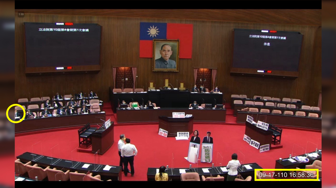 ↑圖說:針對立委黃國昌指控上班時間濫用公務車,法務部前部長蔡清祥澄清,2021年9月17日週五當天是立法院院會,他整天都在立法院備詢,有照片爲憑(黃圈處)。(圖片來源:蔡清祥提供)