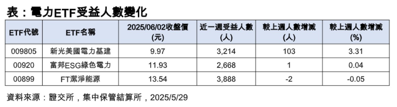 檢視國內3檔電力ETF近一週受益人數變化情形,以新光美國電力基建ETF(009805)單週增加103人最多,成長約3.31%,其他兩檔ETF受益人數變動不大。