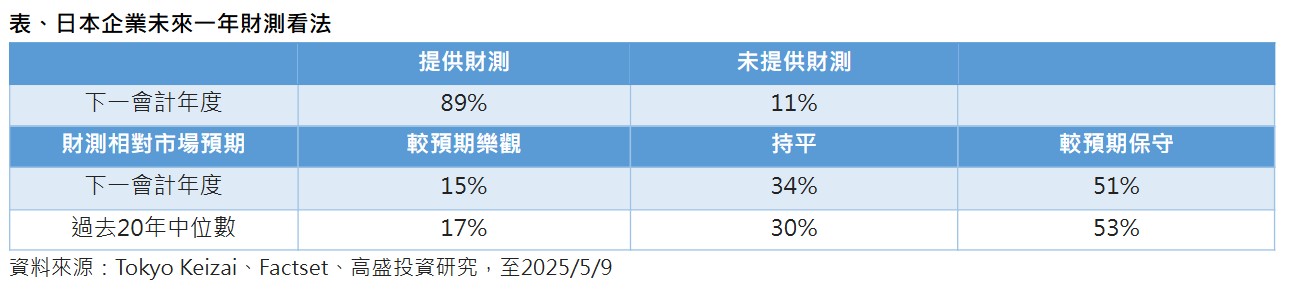 第一金量化日本基金協管經理人高若慈指出,受到目前尚未明朗的關稅政策影響,不少日本企業對未來財測提供較為保守,不過,至5月上旬也有89%日本企業公布未來一年財測指引,其中,較市場看法樂觀的企業有15%,持平佔比34%,較市場預期保守則為51%,相較於過去20年的財測看法,差異並不大,市場並未受到關稅政策影響,對下年度的財務作出極端保守與悲觀的財務看法。