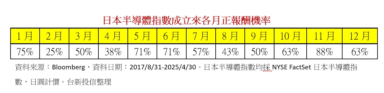 根據Bloomberg 資料統計,日本半導體指數自2017 年8月底成立以來,截至2025 年 4 月底止,共計77個月份,其中,每年有4個月份正報酬機率大於 7 成,分別為1月、5月、6月與11月,其中又以 11 月正報酬機率最高。