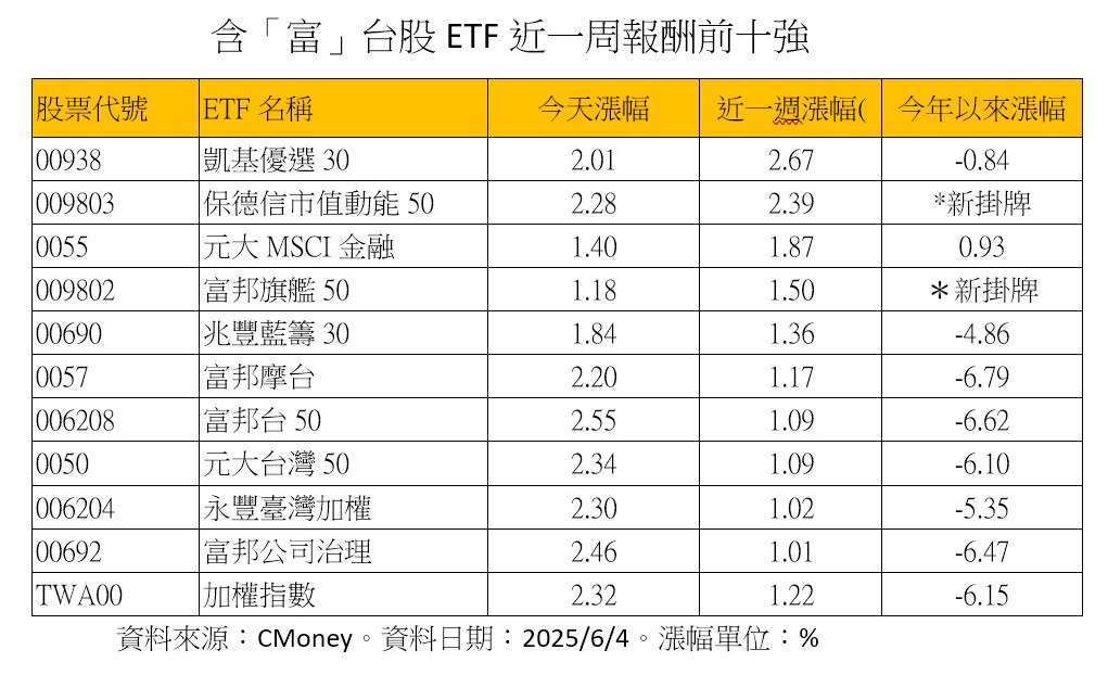 法人表示,多檔台股ETF近期調整成分股,新增富邦金、國泰金等金融股,例如凱基優選30(00938)即是一例,目前持有富邦金近15%,加上其他金控成分股,金控股相關持股權重高達五成。